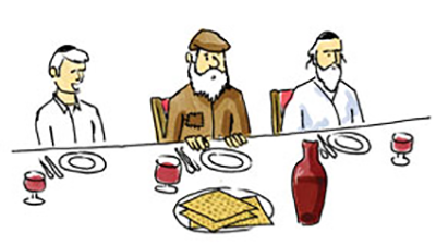 הגיע חודש ניסן, ליל התקדש החג ממשמש ובא. היהודי טוב עליו לבו. הוא ילך אל בית הכנסת, ושם, כמנהג יהודים המקיימים את דברי ההגדה: "כל דכפין ייתי ויאכל", יוכל גם הוא להסב אל שולחן הסדר ולאכול מטעמים שכמותם לא טעם זה עידן ועידנים. אולם הוא לא שכח את חברו הגוי. עמד והשיאו עצה: שמע נא, היום בערב חל חג גדול ליהודים, מסובים הם בפאר אל שולחנות ערוכים מכל טוב, ומשתדלים להכניס אל בתיהם אורחים מחוסרי יכולת. כל אשר עליך לעשות הוא, לבוא אתי אל בית הכנסת. בתום תפילת החג עמוד בתור שבו עומדים כל הקבצנים, הגבאי ישלח אותך אל ביתו של אחד המתפללים, ושם תוכל להנות מכל מטעמי ליל הסדר.