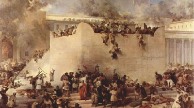 עד שהגיע היום שנקבעה בו בכיה לדורות, היהודים הנצורים שברחו לתוך בית המקדש לא עצרו כח, ואז "ממרום שלח אש בעצמותי"… הרומאים הציתו אש בלשכות ההיכל: קול בכי נשמע מציון: "איך שודדנו??…"