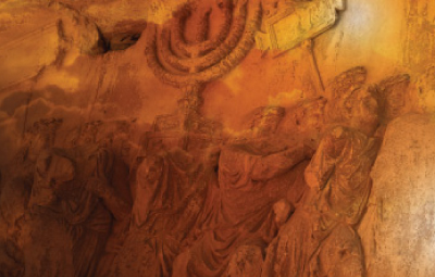 הרומאים שטפו לתוכו כנהר אדיר. באותה שעה עמדו הלוויים על דוכנם ושרו שיר של יום. כשהשיר עדיין על שפתותיהם, נטבחו בידי הרומאים. טיטוס היה שיכור ניצחון. הוא ניגש אל הפרוכת שהבדילה בין ההיכל לבין קודש הקודשים. במכת חרב הוא דקר את הפרוכת העדינה. מופלא, במקום שפגעה החרב בפרוכת, עלה ובצבץ דם… טיטוס פרש את הפרוכת על הארץ והניח בתוכה את כלי המקדש היקרים. הוא קשר את קצות הפרוכת לשק אחד גדול, כדי להוביל את השלל לרומא בתהלוכת הניצחון שלו.